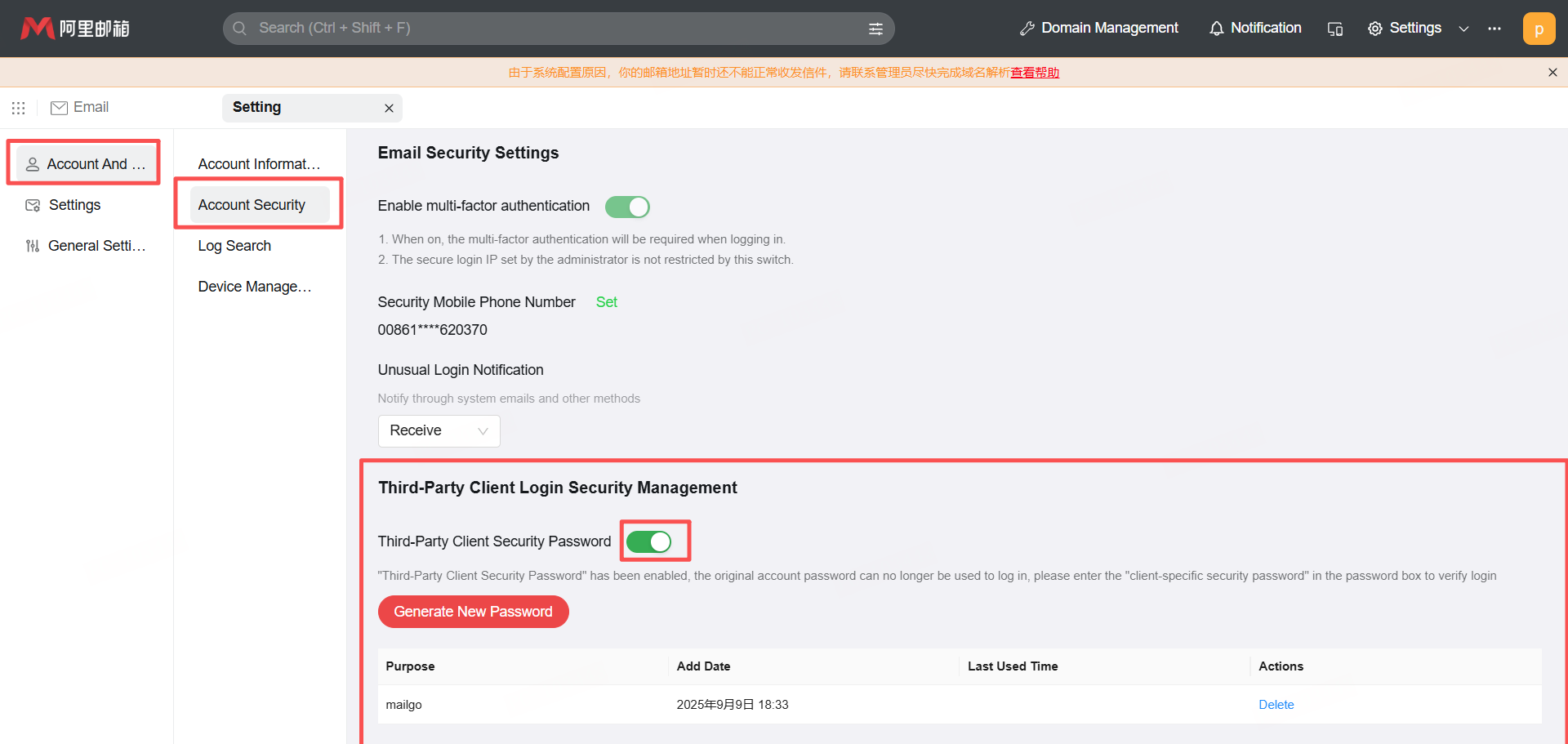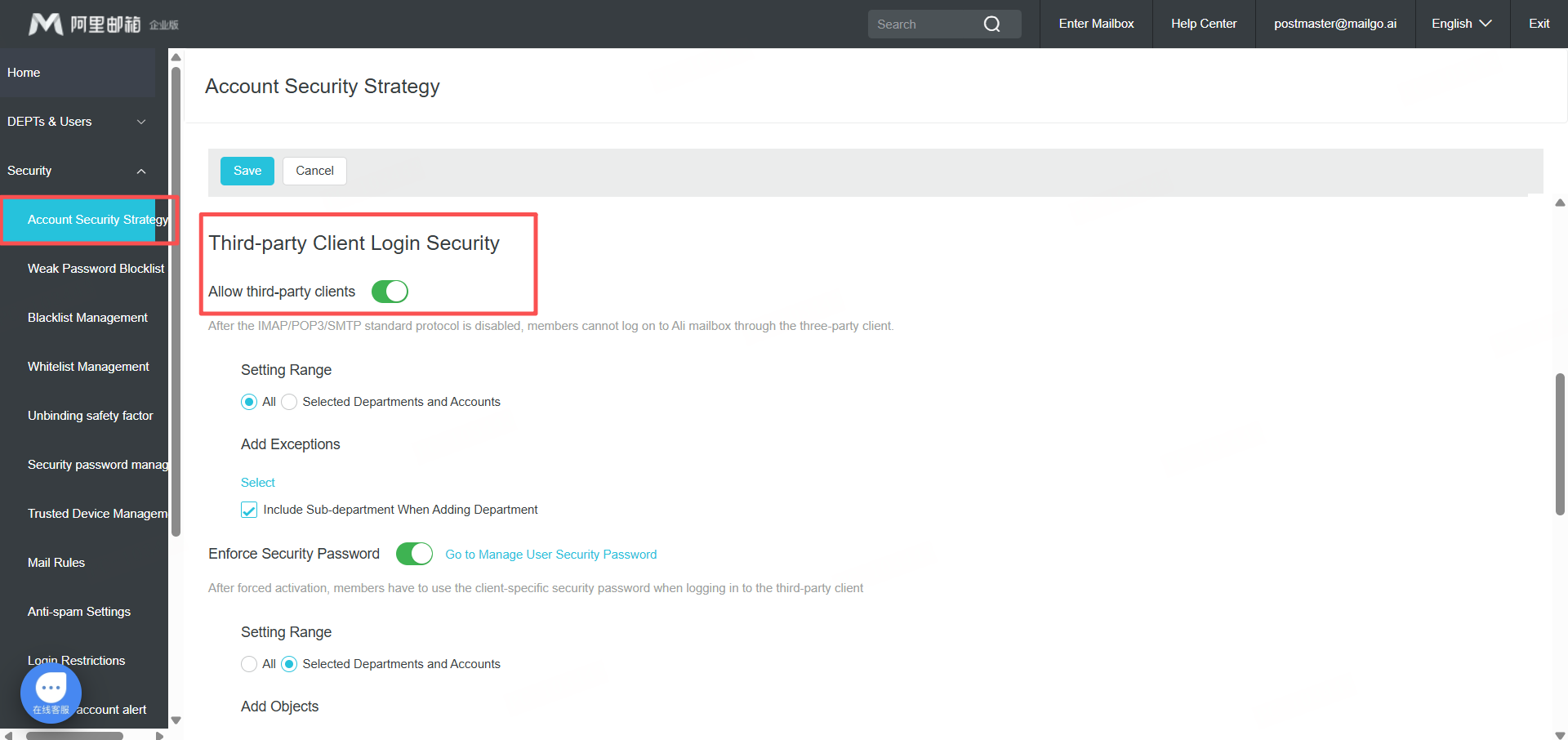 From the Account Security Strategy(https://qiye.aliyun.com/admin/),locate and click on Third-party Client Login Security, Then select Allow third-party clients.