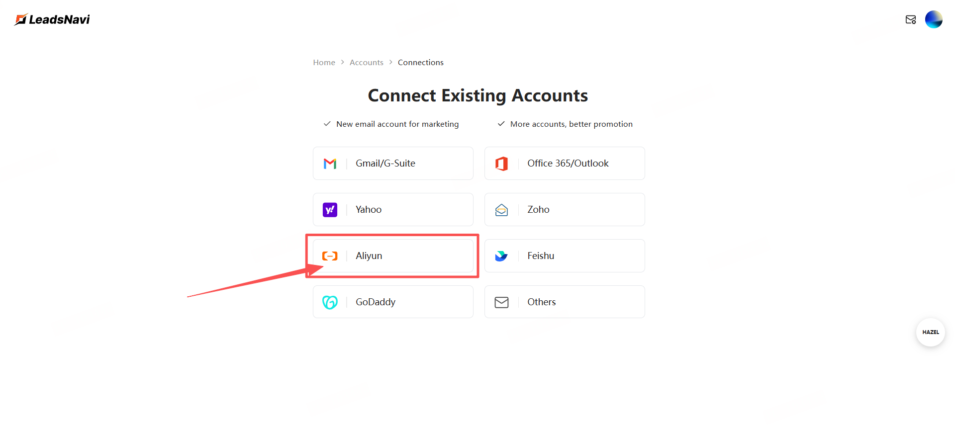 Once all settings are applied, log in to your LeadsNavi account, go to Accounts, and enter your AliMail credentials. LeadsNavi will automatically detect your SMTP and IMAP configurations to complete the connection.