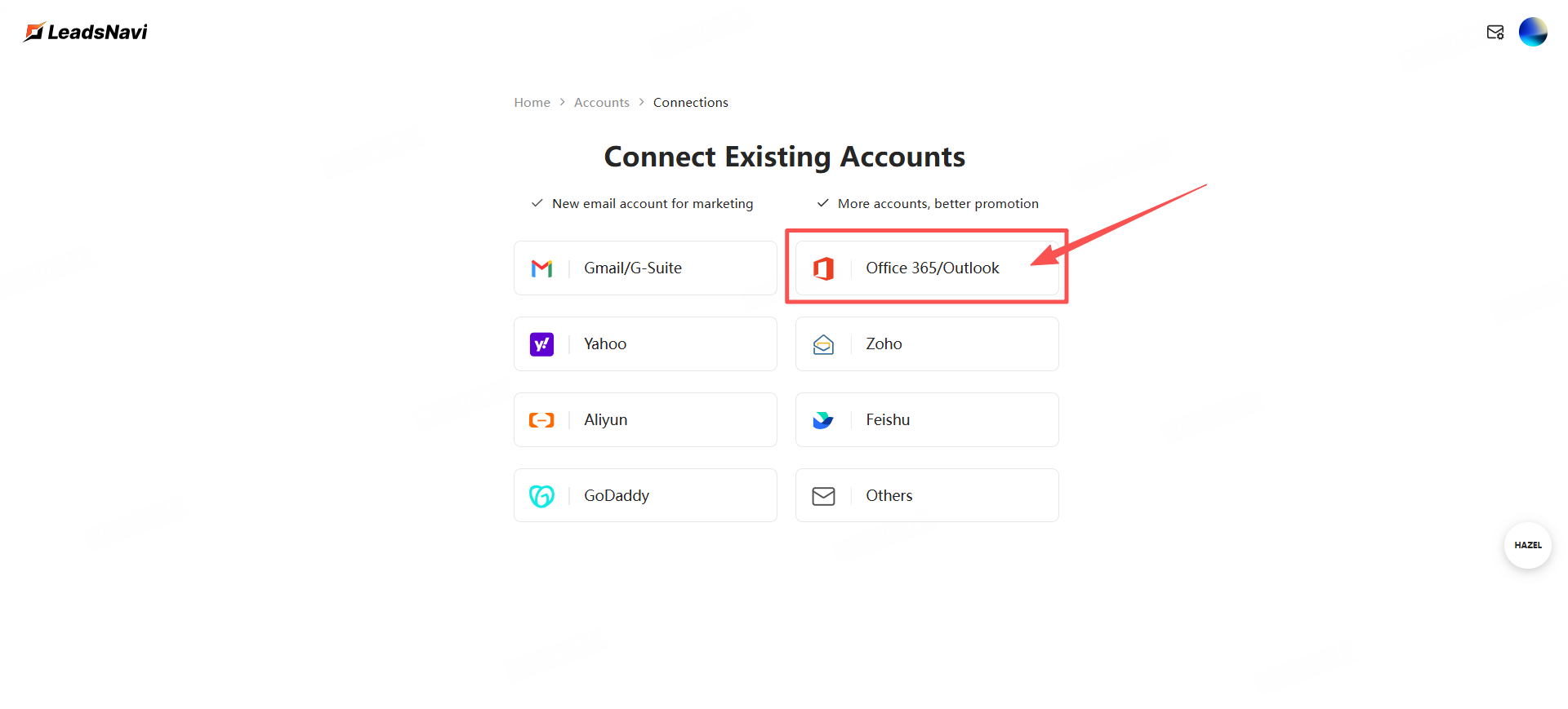 - After the waiting period, log in to your LeadsNavi account, navigate to Accounts, and enter your email credentials. Leadsnavi will automatically detect the enabled SMTP and IMAP settings to complete the binding process.