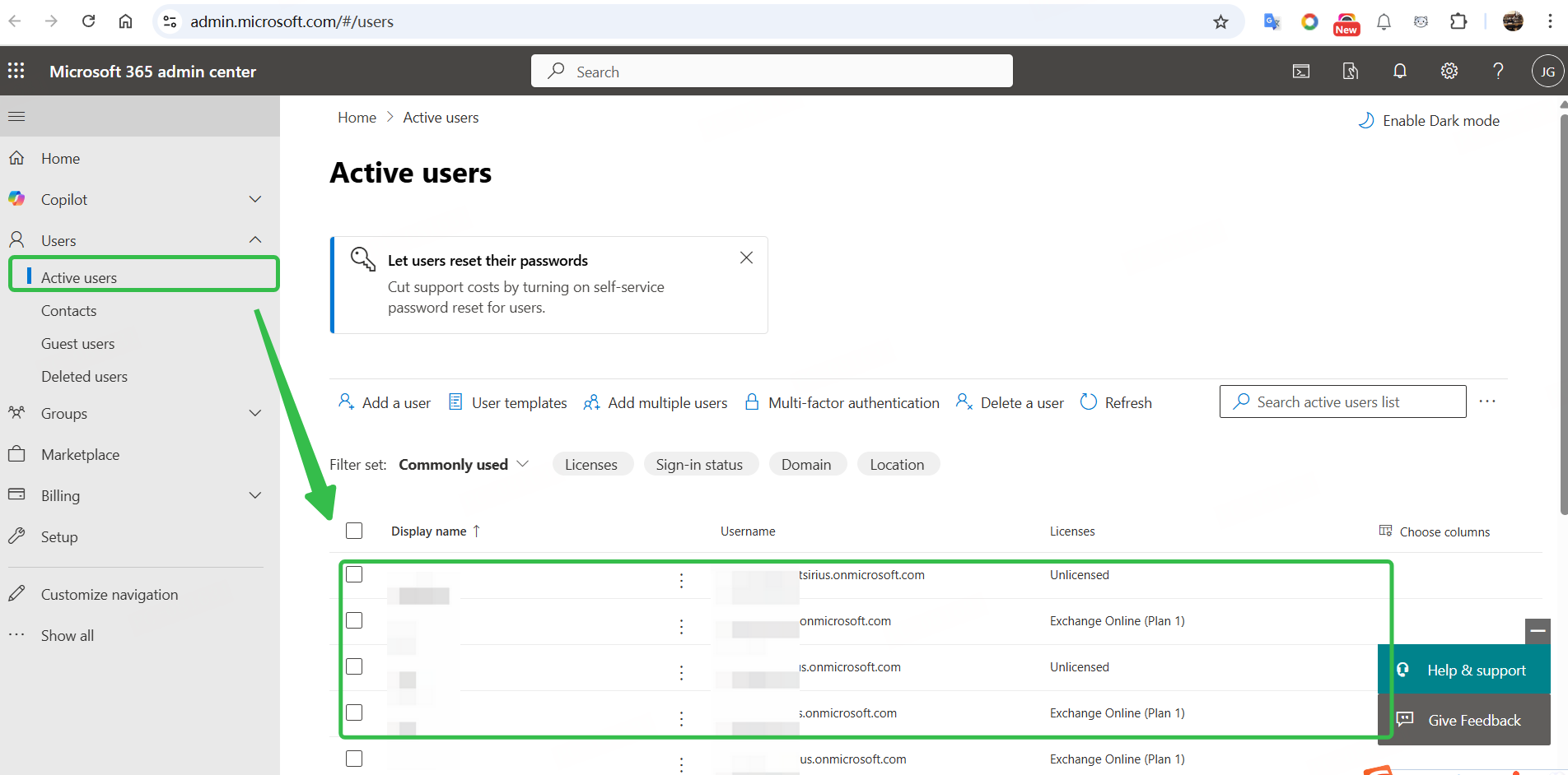 From the admin dashboard, locate and click on Users (https://admin.microsoft.com/adminportal/home#/users) in the left-hand menu, then select Active Users to view your organization’s user list.