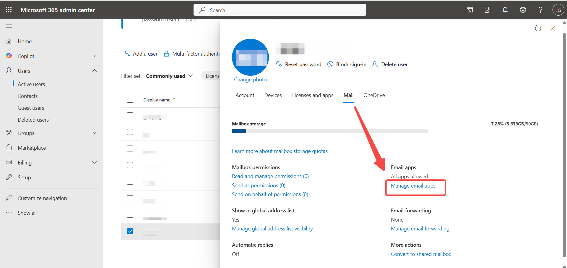- In the user details panel, navigate to the Mail tab.