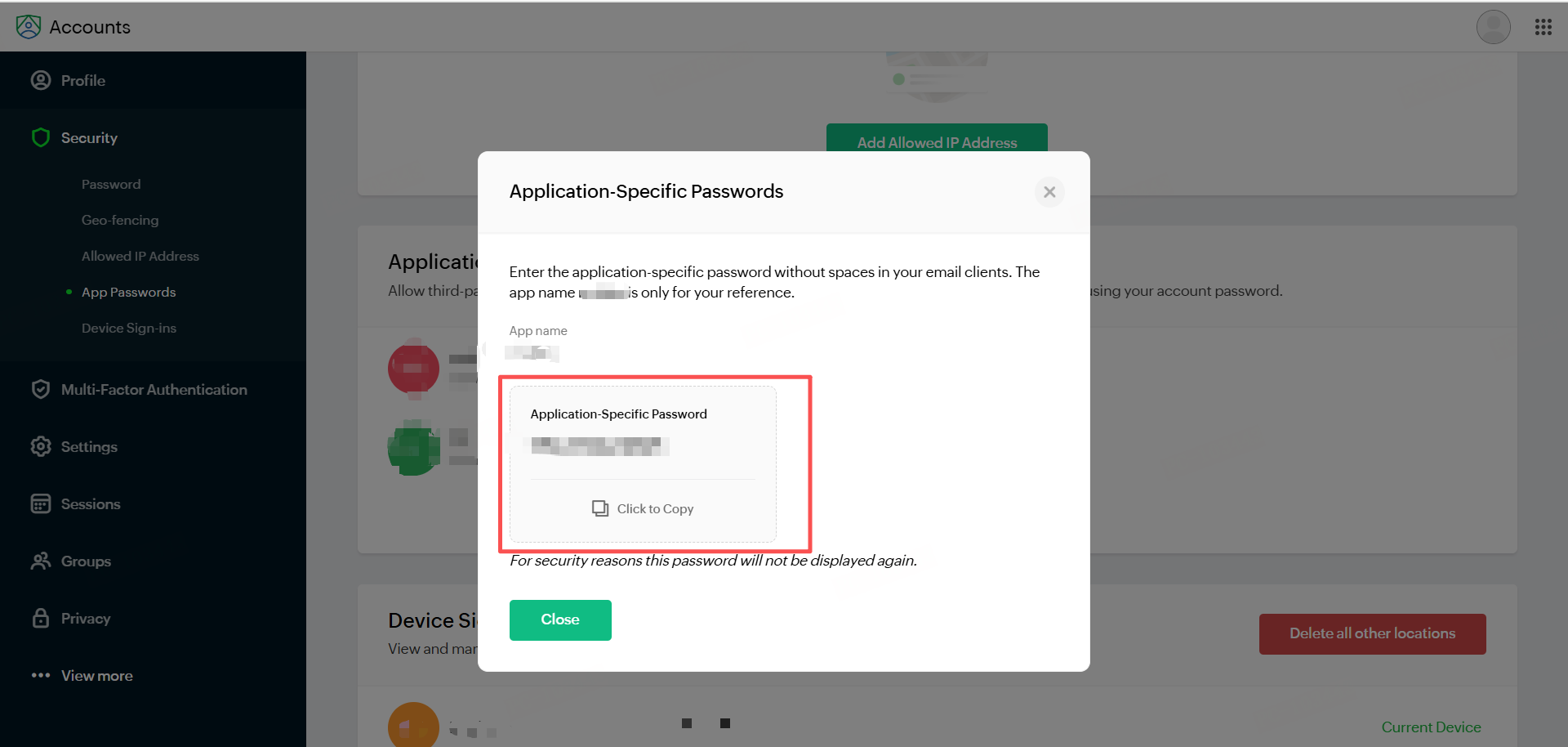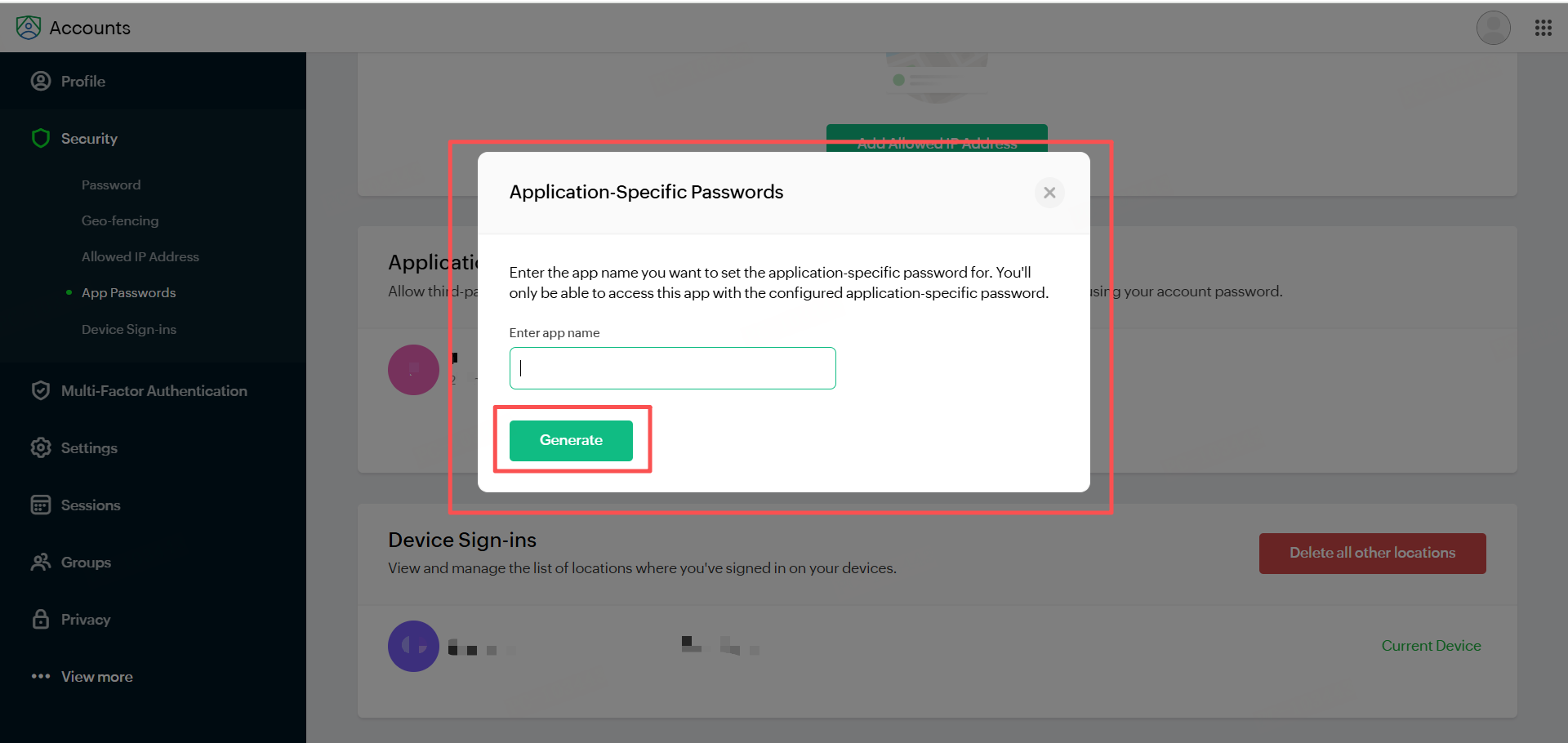 - Enter the App Name, click Generate to create the password