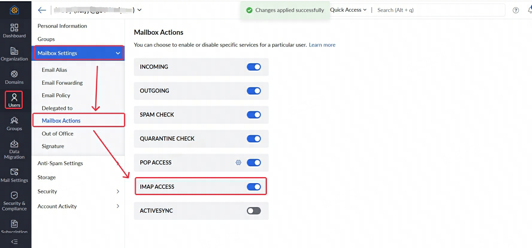 - Click Mailbox Settings, then click Mailbox Actions. Locate IMAP Access and select Enable